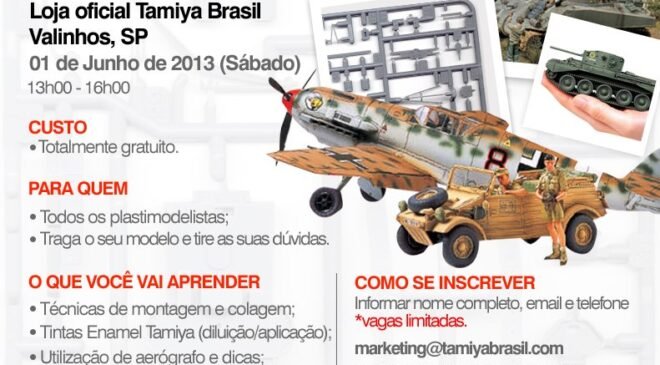 O workshop será ministrado na Loja da Tamiya no dia 1º de Junho, na cidade de Valinhos – SP, e será ministrado por alguns membros do Grupo GPC de Plastimodelismo, tenho certeza que será um evento bastante proveitoso.