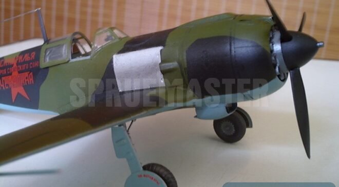 Pintura: para a camuflagem eu utilizei apenas as tintas russas da Akan desta vez. Tendo novamente o livro de Pilawski como guia, usei as cores de 1942: verde AMT-4 (73001) e preto AMT- 6 (73043)para a camuflagem superiora e azul AMT-7 (73002) para a parte de baixo do avião. De acordo com as instruções da Aeromaster o avião de Meroño seria todo pintado de verde, mas não existem fotos ou documentos que comprovem isso. Concluí que isso pode ter sido uma informação errada já que a folha da Aeromaster datava de mais de 15 anos atrás e que era melhor pintar o La-5 com a camuflagem padrão, que parece ser a mais provável.